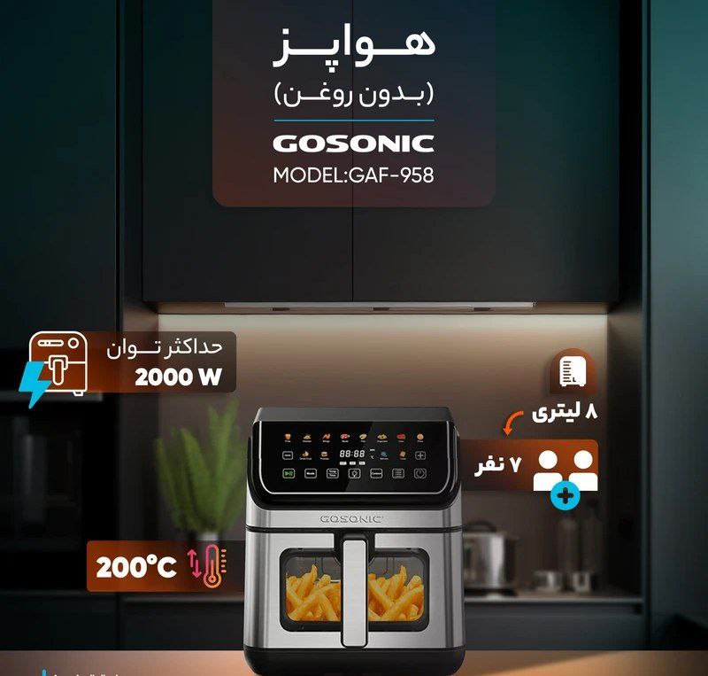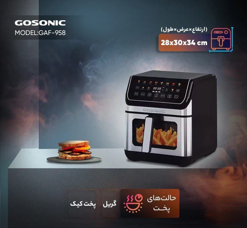 سرخکن بدون روغن گوسونیک مدل 958 با طراحی مدرن و رنگ مشکیسیلور، از بدنهای مقاوم متشکل از استیل ضدزنگ و پلاستیک فشرده ساخته شده است که ضمن برخورداری از دوام بالا، نمایی شیک و حرفهای به فضای آشپزخانه میبخشد. این دستگاه به دو المنت حرارتی مجزا مجهز شده که المنت بالایی با توان 2000 وات و المنت پایینی با توان ۵۰۰ وات، مجموعاً قدرتی معادل ۲۰۰۰ وات را برای پخت مؤثر و یکنواخت انواع غذاها فراهم میکنند. مخزن داخلی و سینی پخت از جنس آلومینیوم با پوشش نچسب سرامیکی تولید شدهاند و قابلیت پخت همزمان در دو طبقه مجزا را فراهم میسازند. ظرفیت ۸ لیتری دستگاه، پاسخگوی نیاز خانوادههای متوسط و پرجمعیت بوده و امکان تهیه حجم قابل توجهی از غذا را در یک نوبت فراهم میکند. این مدل به یک نمایشگر دیجیتالی رنگی مجهز است که دسترسی سریع و آسان به ۱۲ برنامه پخت متنوع را ممکن میسازد. همچنین وجود تایمر قابل تنظیم تا ۶۰ دقیقه به همراه سیستم قطعکن خودکار، ایمنی و دقت عملکرد دستگاه را افزایش داده است. سرخکن بدون روغن گوسونیک مدل 958 از جمله محصولات جدید و قدرتمند این برند بهشمار میرود که با بهرهگیری از فناوری روز، طراحی کاربردی و ساختار مقاوم، تجربهای سالم و پیشرفته از آشپزی را برای کاربران فراهم میسازد.