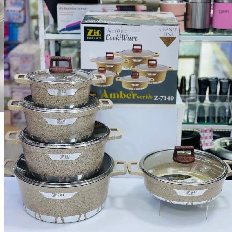 سرویس قابلمه گرانیتی Zio مدل 7140 یکی از مدلهای پرطرفدار این برند ترکیهای است که با طراحی ساده و عملکرد قابلاعتماد، گزینهای مناسب برای استفاده روزمره در هر آشپزخانهای محسوب میشود. این سرویس 10 پارچه شامل 4 قابلمه در سایزهای 20، 24، 28 و 32 سانتیمتر به همراه دربهای شیشهای مقاوم و یک تابه دودسته با روکش گرانیتی نچسب است. بدنه آلومینیومی سبک با توزیع یکنواخت حرارت، کمک میکند غذا بدون چسبندگی و با کمترین میزان روغن پخته شود. دستههای مقاوم در برابر حرارت با طراحی ارگونومیک، کار با قابلمهها را ایمن و راحت کردهاند. سرویس قابلمه Zio 7140 از نظر دوام، روکش داخلی، طراحی ظاهری و قیمت، در سطح قابل قبولی قرار دارد و برای خانوادههایی که به کیفیت و زیبایی بهطور همزمان اهمیت میدهند، انتخاب مناسبی است.